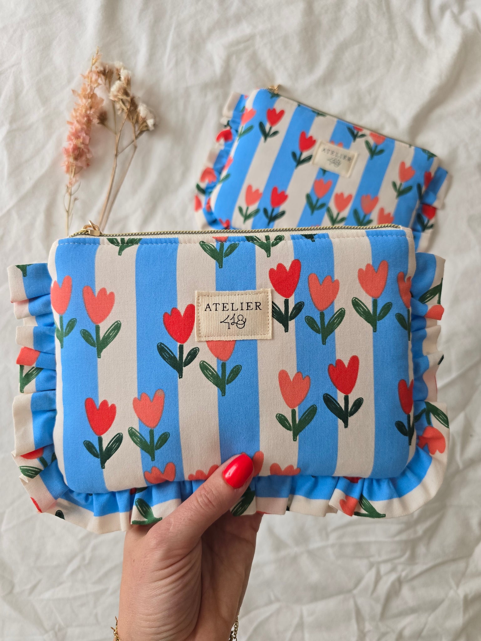 La trousse plate sera parfaite pour organiser votre maquillage, les essentiels de bébé, ou vos objets précieux, La couleur intérieure de la pochette est écru déperlant.
