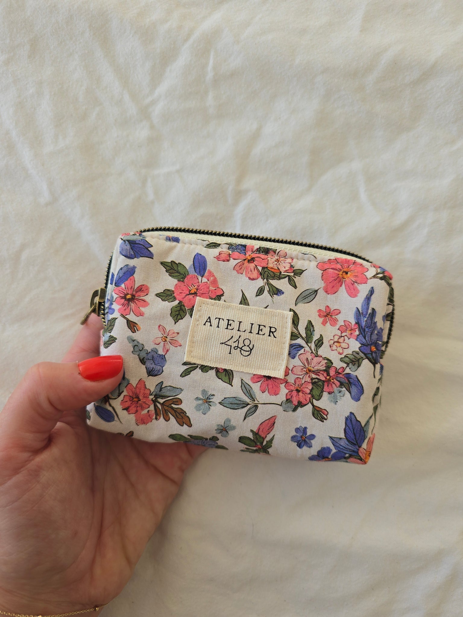 🌱 Composition : Extérieur : Coton fleuri. Intérieur : coton rayé bleu. Fermeture zippée doré ou laiton Chaque pièce est unique, le placement peut légèrement être modifié.