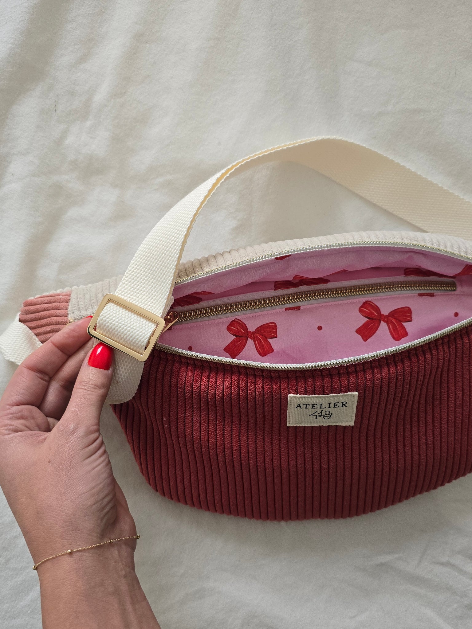 🌱 Composition : Extérieur velours côtelé. Intérieur en coton rose à nœuds rouges.